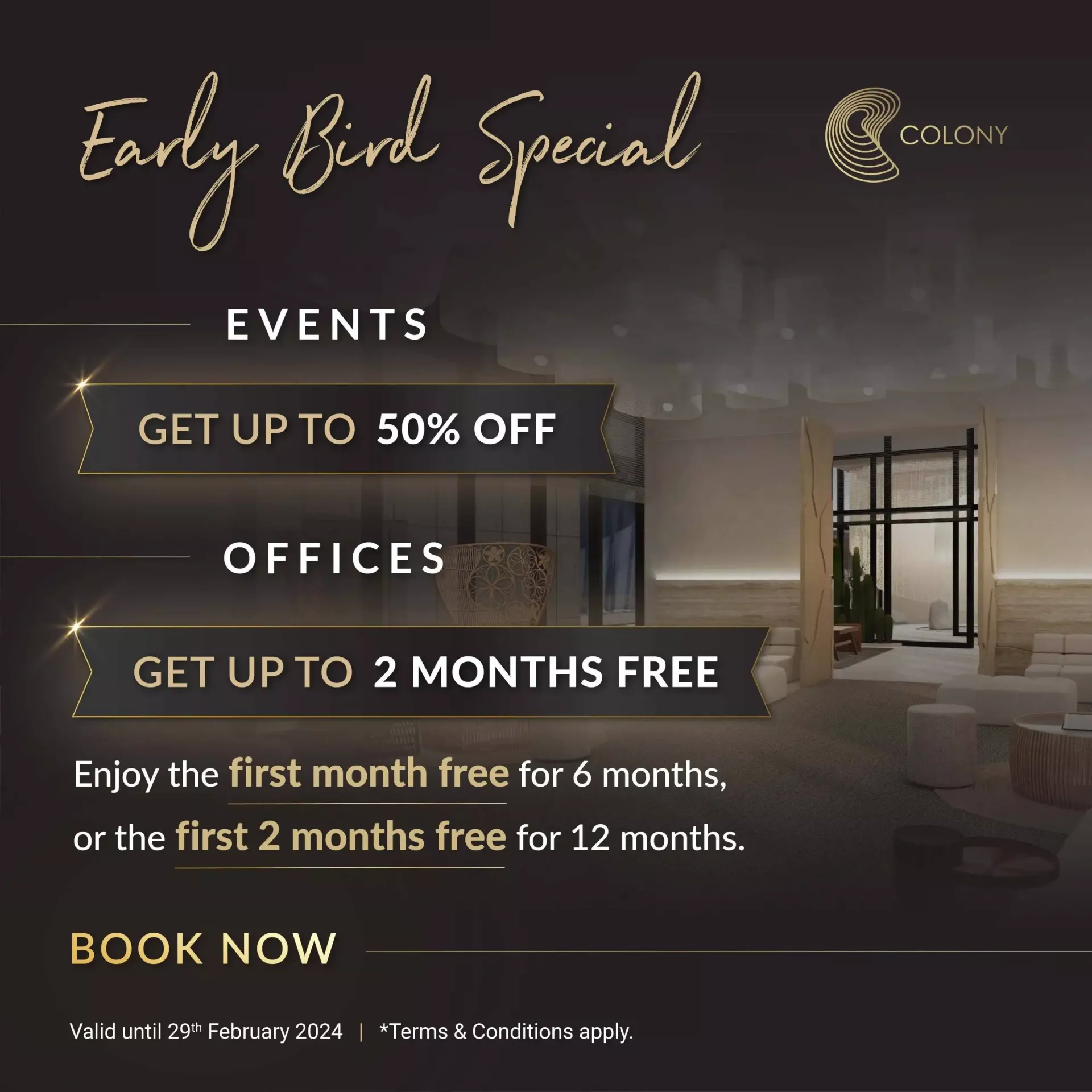 With class and comfort in mind, Colony provides a carefully curated coworking and events space with beautifully designed workspaces that are purposefully imagined for you to create, collaborate, and be inspired. Prestige and productivity go hand in hand with our impeccable interiors and premium amenities, ensuring a seamless experience for both work and events.