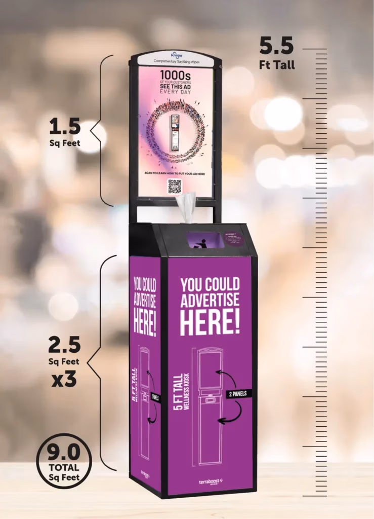 Our exclusive 5’5” tall static and digital wellness kiosks (offering free sanitizing wipes to consumers), put your brand front and center in top retailers across the U.S., keeping them healthy and informed.