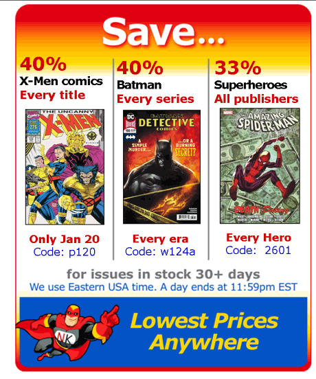 Save 33% to 80% Every Day Five sales every day -- 33% to 80% off. And thousands of inexpensive comics! Get a $4 comic for under 75¢ each. We sell so many, we're happy with a tiny margin.