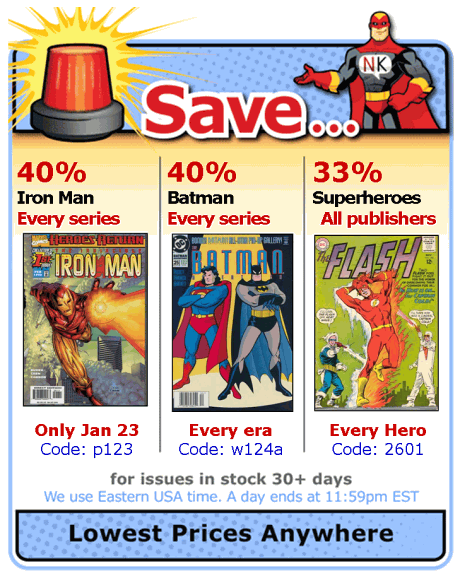 Save 33% to 80% Every Day Five sales every day -- 33% to 80% off. And thousands of inexpensive comics! Get a $4 comic for under 75¢ each. We sell so many, we're happy with a tiny margin.