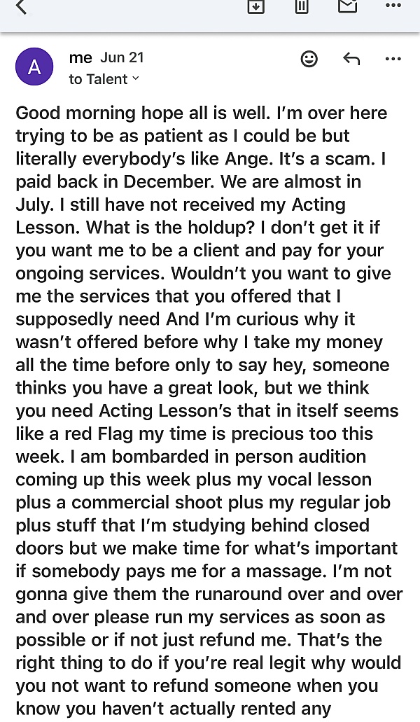 Hi there, I am trying to gather proof of anyone on here can help me years ago. I used adorable talent and had a wonderful experience. However, yours later I found her she now goes by Jessica castings she took my money on a monthly basis without me ever getting any work than six months into it I was told director think I have a great look, but I should pay for Acting classes. She gave me every excuse in the book. It's been over a year. I never actually got my Acting Lesson I ultimately cursed her out and was super pissed because unfortunately the money was paid by Zelle. Has anyone here had this experience I am trying to gather proof I find it very odd that I cannot find her on yelp another red flag. Jessica 'Moultrie is her Instagram has anyone out there had the same experience I really want all my money back. Please reach out to me if you've had the same experience needless to say I just checked the dates it's been over a year and a half and she never refunded me even though she's so ""on busy. I've estimated a total of about $1800 as I was paying for monthly service for six months then paid an additional 3 to 475 with what was supposed to be Acting Lesson that I never actually received.