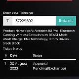 This is in reference to the warranty claim against ticket ID ******* of your product boAt Airdopes 161 - Pebble Black