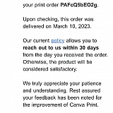 There was a serious delay on the delivery, local Fedex was at fault. Fedex never responded to me, nor did they ever contact me, while Canva replied on the same day. Since these were wedding invitations, which were time sensitive, they expedited a second delivery and gave me a coupon for another purchase, all the while being super professional and very quick in their responses. Absolutely amazing.