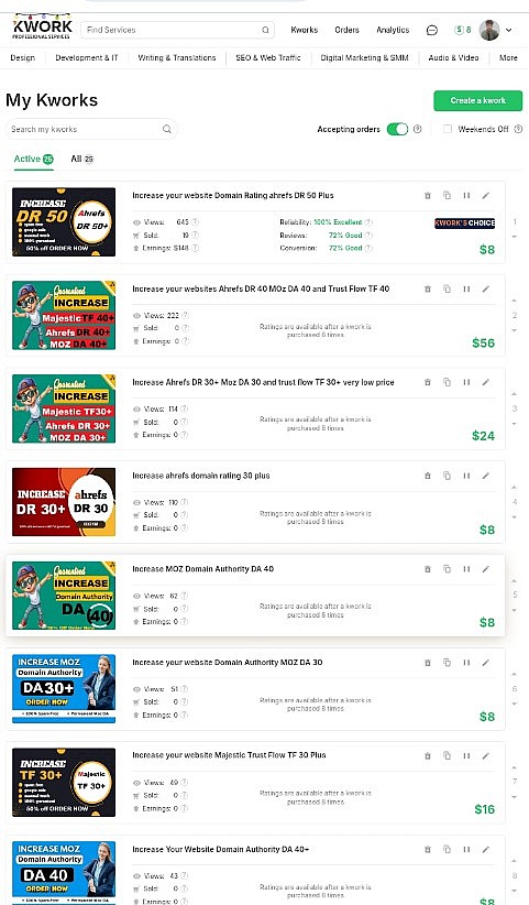 I joined Kwork more than one year ago. I had a bad experience with Fiverr, and I found a great community at Kwork. I feel very valued for my offerings, and I have had the same revenue I had with Fiverr back then.