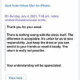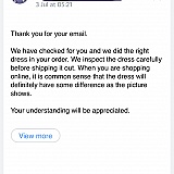 "There is nothing wrong with the dress itself. The difference is acceptable. It's unfair for us to take responsibility. Just keep the dress or you can send it to your friends or resell it locally. The return is really not possible.