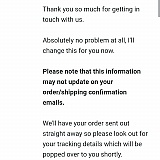 I accidentally ordered my parcel to an old address and emailed asking if I could change. A day later (Boxing Day) I got a quick reply saying they had changed my address and it was all sorted :)