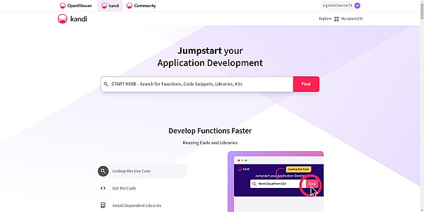 Kandi from Open Weaver helps developers find reusable libraries for specific requirements in their application development.Helps develop applications faster.1-click installation of working codes and ready availability of dependent libraries is like a boon for programmers.Kits help develop applications for popular use cases from scratch. Kandi helps find the right libraries or code snippets. Code snippets help for a better understanding of the library. Developers can keep track of popular and new libraries and some new resources across a large number of topics. Kandi helps developers to build their app projects in various languages.